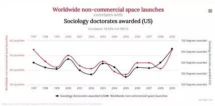 图1. 全球非商业性空间飞船发射数量与美国社会学博士毕业数量之间的关系[1]