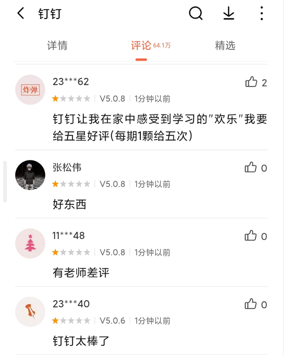 由于钉钉APP的网课功能的恐怖性强大,被孩子们抓住猛打差评。