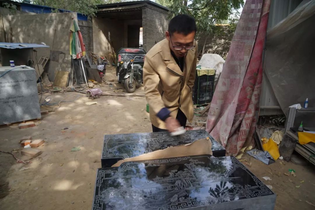 张展昭,就是这十万匠人中的一个,从事石碑影像雕刻十年。影雕,是用特制的针,在墨玉、山西黑等石材上雕琢图案的工艺。与普通石雕相比,影雕更为细腻,雕的人像似照片一般逼真,这项技艺被广泛运用在墓碑的制作中。