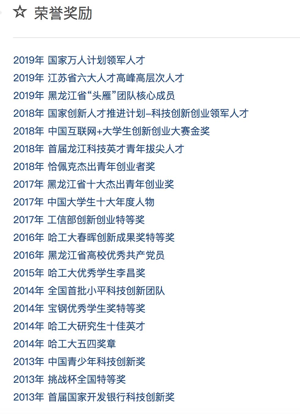 先后入选国家万人计划领军人才、国家创新人才推进计划、首批龙江科技英才、江苏省六大人才高峰高层次人才和姑苏创新创业领军人才等计划,荣获中国青少年科技创新奖、中国大学生十大年度人物、省十大杰出青年创业奖、恰佩克杰出青年创业者奖等荣誉。所带领的团队获评全国首批小平科技创新团队、中国创新创业大赛优秀团队和国家开发银行科技创新团队。