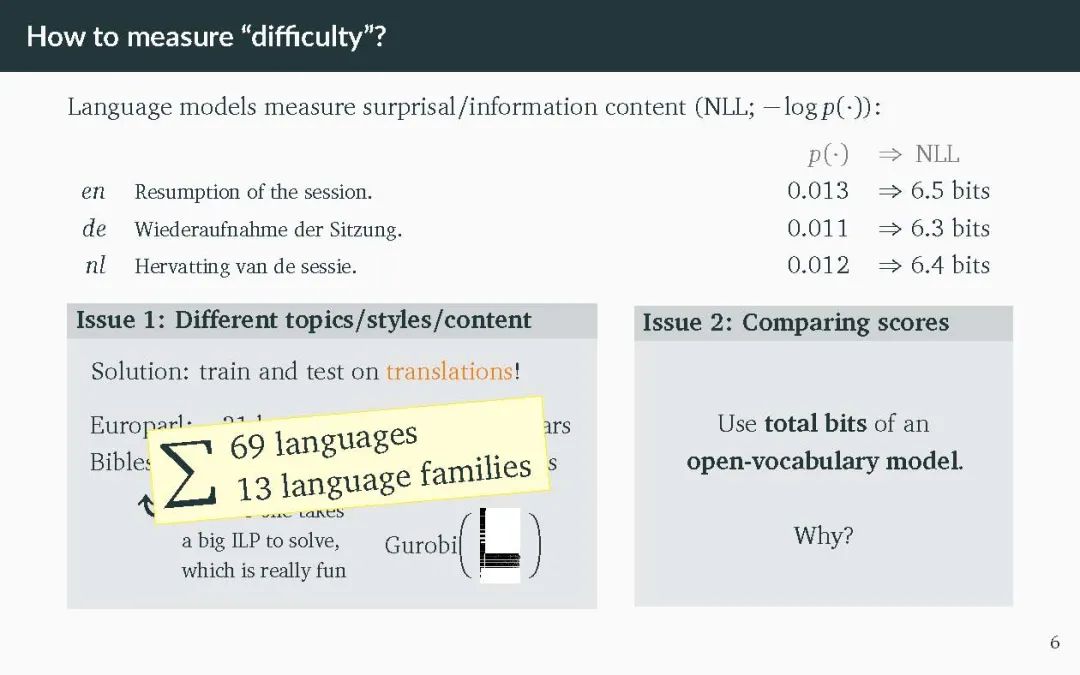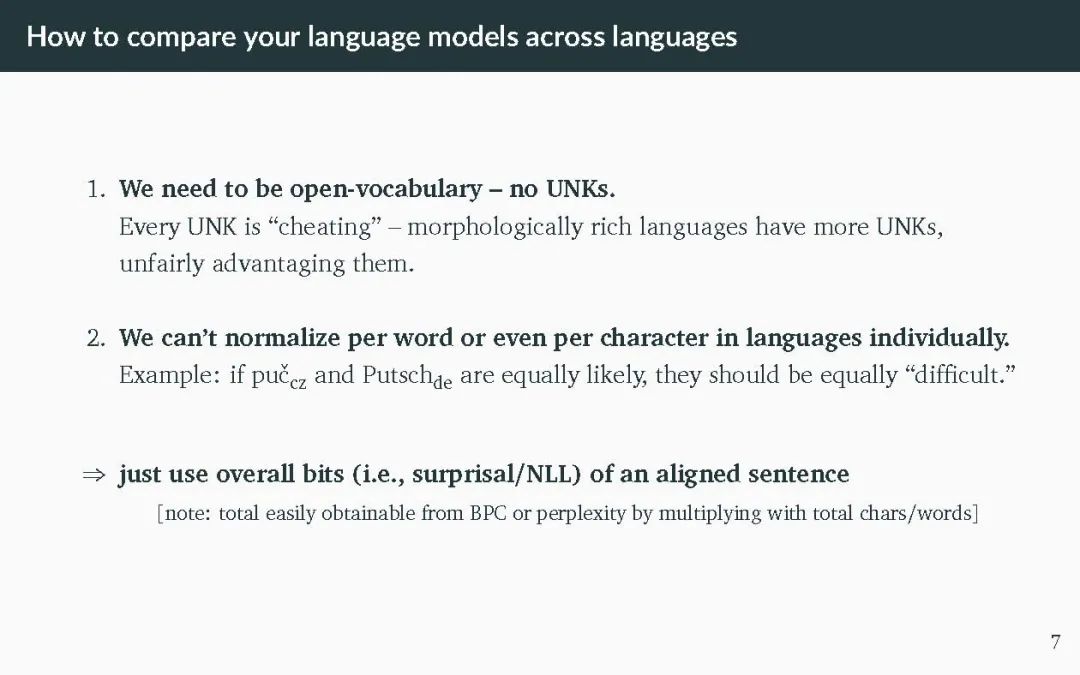 本讲座的大部分内容将致力于两篇论文,它们试图做到这一点:通过使用概率和基于信息理论的度量,公平地比较生成模型的表现。第一篇论文详细介绍了如何通过总比特来评价(单语)开放词汇语言模型,第二篇论文思考了“信息”的意义以及如何使用它来比较机器翻译模型。