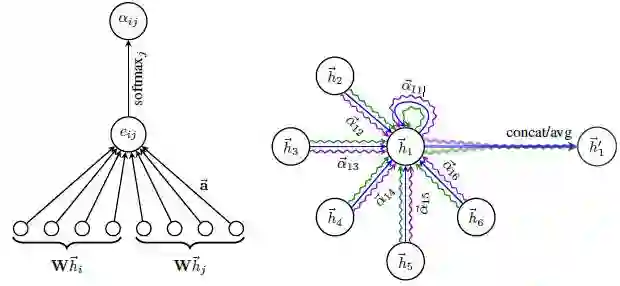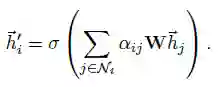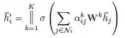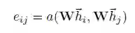 给定图上所有节点在当前层的输入h,假设我们当前需要更新节点i的表示,j表示节点i的一个邻居。那么节点j对i的重要性系数的计算公式如下: