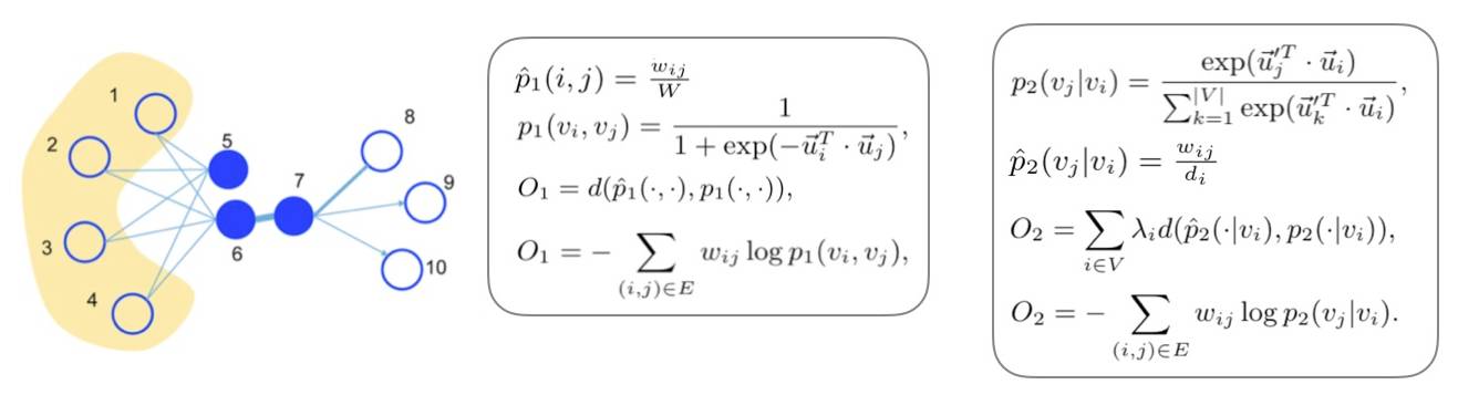 LINE(Large-scale Information Network Embeddings) 直观上看其实并没有用随机游走。但是[2]将其归类到随机游走的范畴,原因是它和 DeepWalk 的框架类似地应用了概率损失函数。即通过最小化节点 i,j 相连的经验概率 ^p(i,j) 与向量化后两个节点相似性 p(vi,vj) 的距离,并且同时考虑了一阶和二阶相似度(优化两个损失函数),这和随机游走的底层动机是相似的。在实际计算过程中,作者引入了一系列预处理和优化方法(比如负采样),来加快学习性能。
