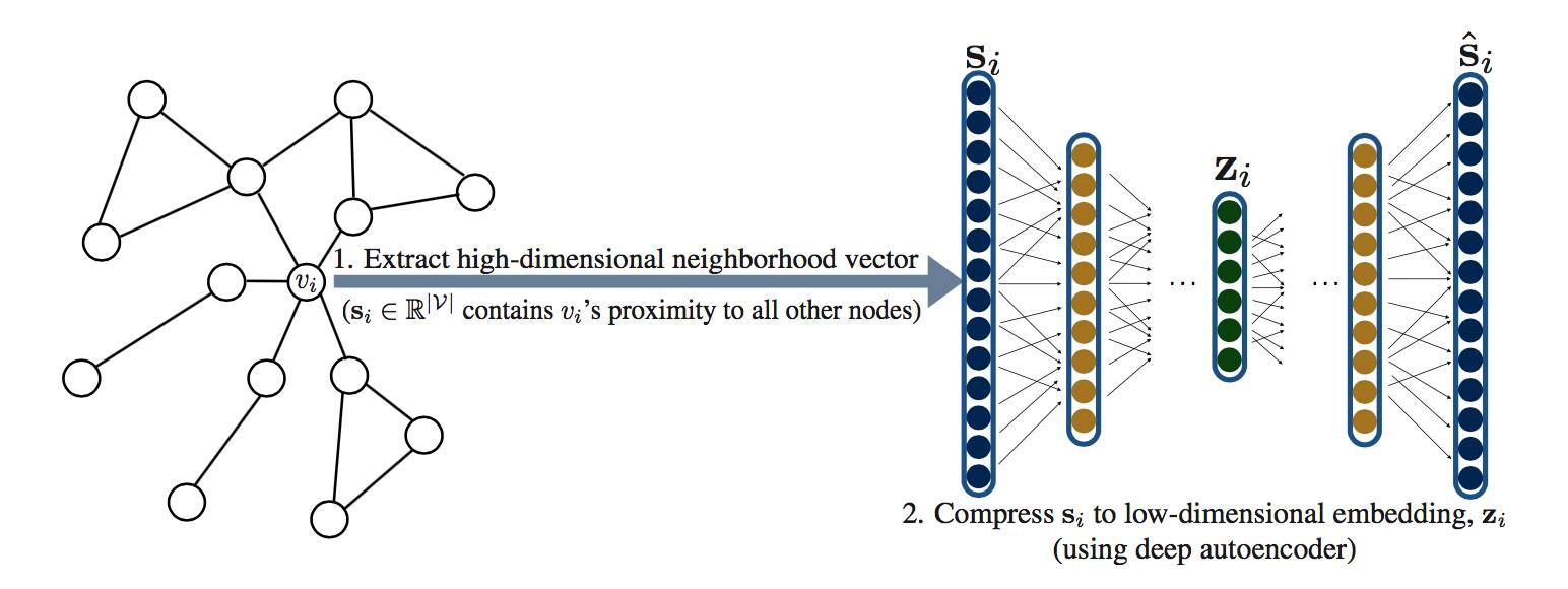 这种方法遇到一个较大的问题是,其输入向量维度被限制为|V| ,一方面对网络规模有一定限制,另一方面对新节点的接受程度不好(新节点加入后可能需要重新训练整个网络)。