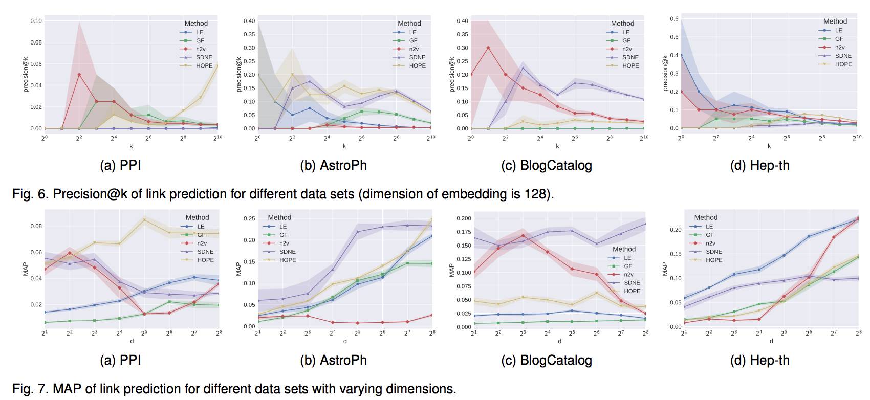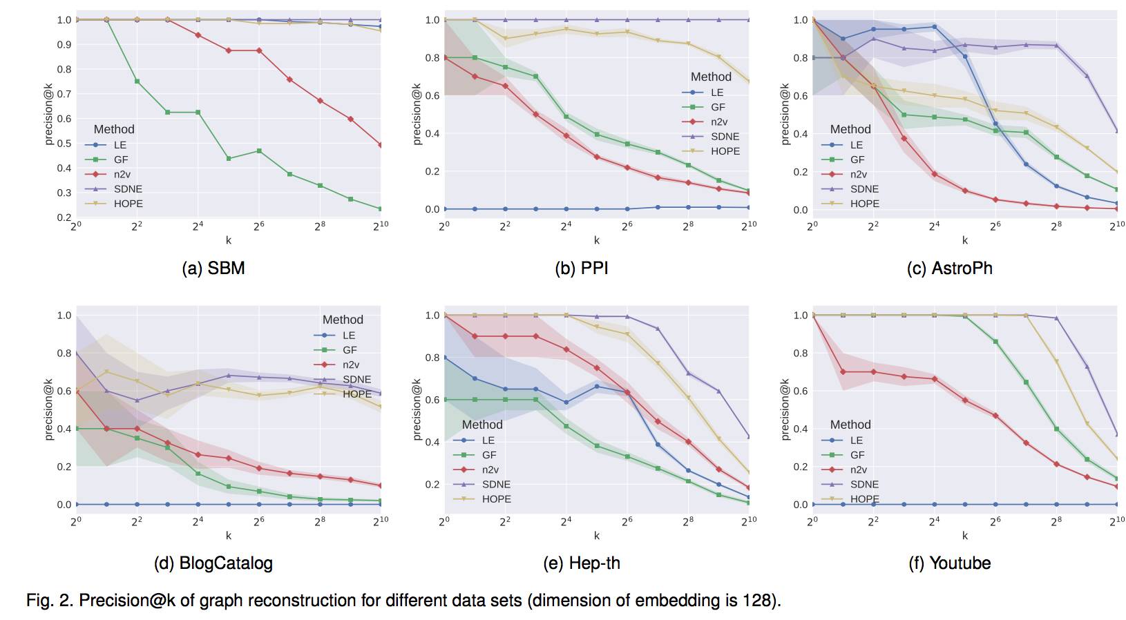网络重构,是从向量化的节点出发,重新连边构建网络。我们发现 保存了高阶节点关系的模型往往能够更好地重构网络 ,这也符合直观认识。SDNE 几乎在所有数据集上击败了其他模型。