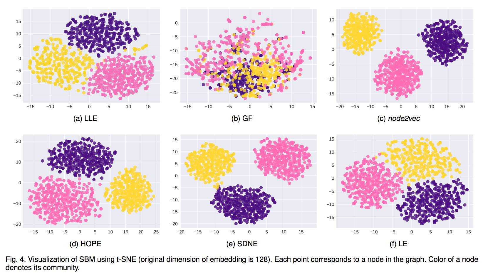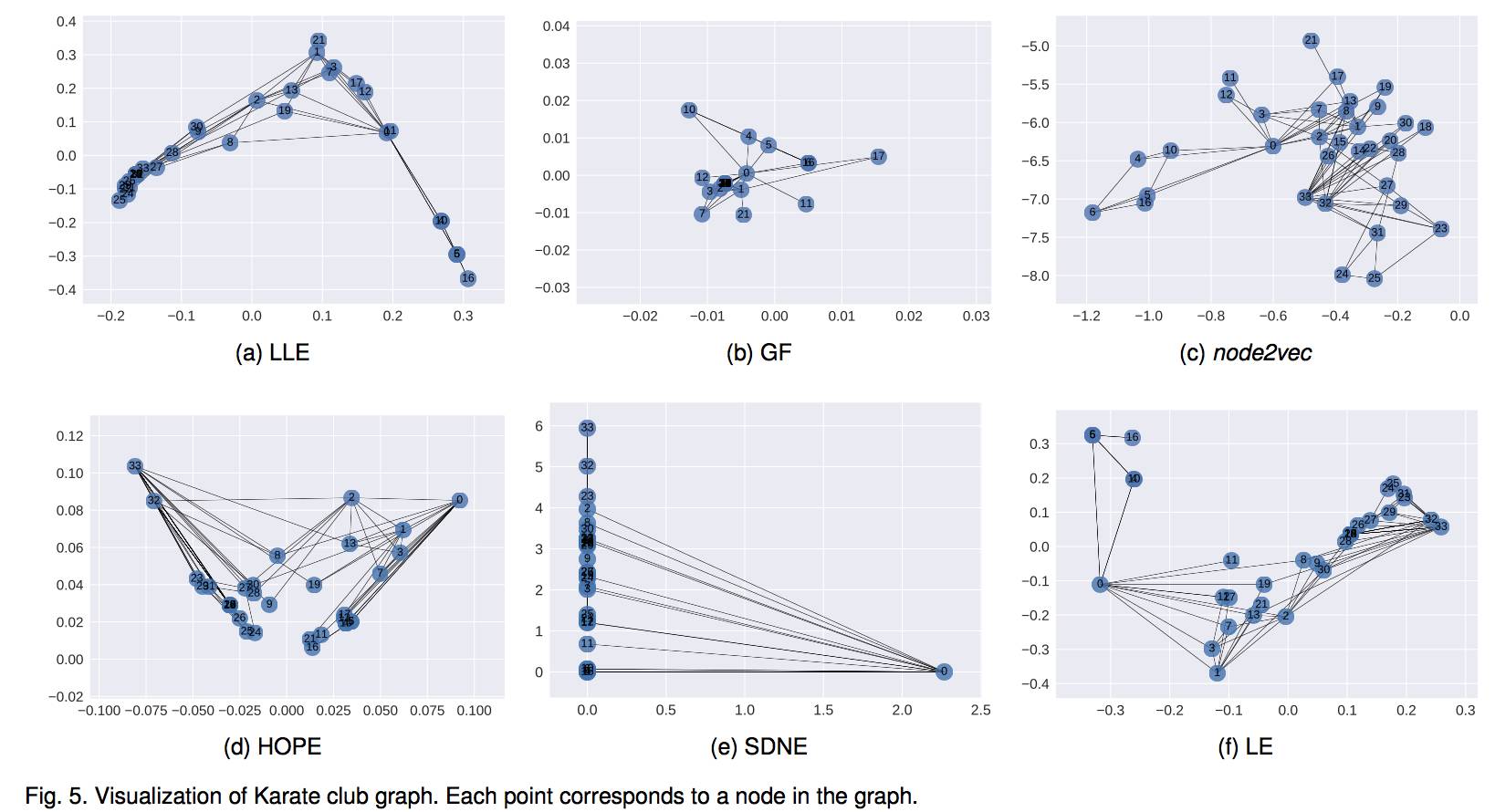 从网络结构和节点性质来看,SDNE 和 node2vec 保留了原始网络较多信息。尤其是 SDNE 把节点0单独放到了很远的位置,因为它是社区间的 bridge 节点。而 HOPE 对 0、32、33 的社区中心节点属性刻画的比较好,并且明显地划分出两个社区。GF 的表现依然比较差,除了把度大的节点放在了中心,叶子节点放在了周围,并没有很好的区别社区距离。