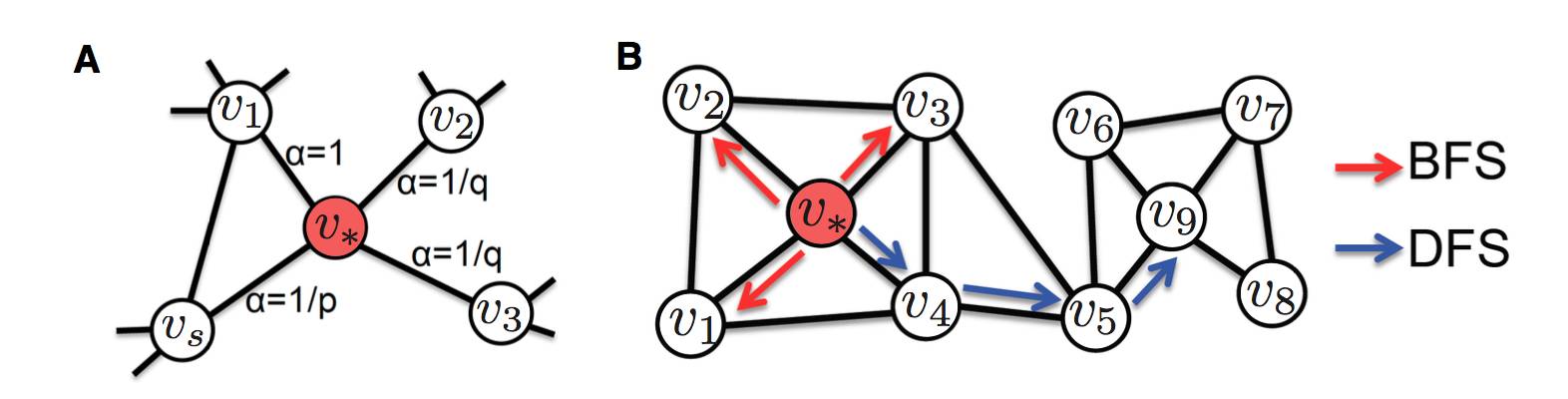 Node2vec 是对 DeepWalk 的一种更广义的抽象,它引入了 biased-random walks,用来刻画每次随机游走是偏深度探索(DFS)还是广度探索(BFS),分别侧重社区结构和节点重要性的信息。由于 node2vec 有 p 和 q 两个超参数,所以它是一个比较灵活的模型框架。后面也会讲到,它在节点分类问题中有着不俗的表现。