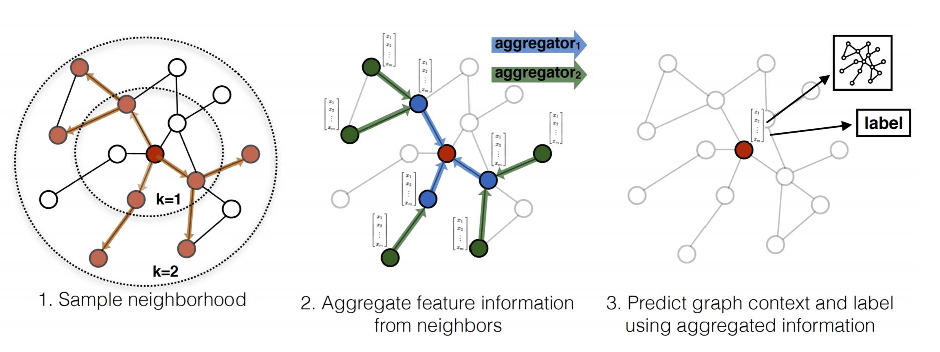 GCN(Graph Convolutional Networks) 就是其中的一类。上图是 GraphSAGE 算法 [3]的流程步骤。相比 SDNE 类的算法,GCN 的输入向量不必限制在 |V| 维,所以输入数据可以大大减小维数。因为 GCN 在网络结构的基础上,又引入了节点信息,所以在节点分类、链路预测等任务上,比只考虑网络结构的模型有更好的表现,当然这也取决于数据的丰富程度。