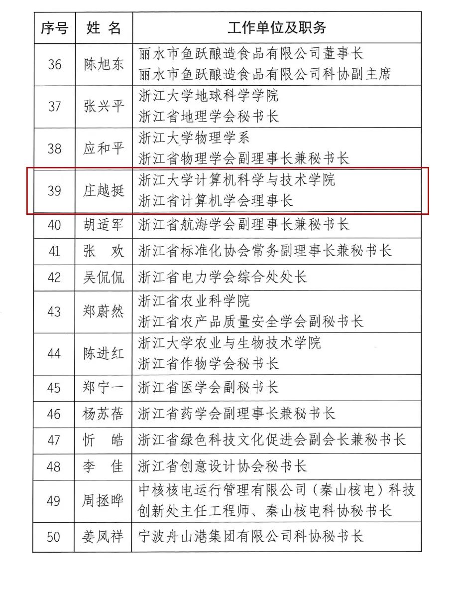 近期,为驱动浙江省社会团体创新发展服务,浙江省科学技术协会发布《关于浙江省科协系统成绩突出成绩和个人通报表扬的决定》的通知,表扬了一批典型榜样,浙江省计算机学会理事长庄越挺教授喜获学会工作 “成绩突出个人” 荣誉。