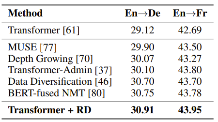 表1:R-Drop 在 WMT14 英语->德语与英语->法语机器翻译上的结果