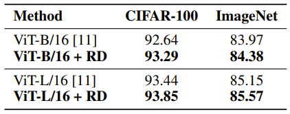 表2:R-Drop 基于 Vision Transformer 在 CIFAR-100、ImageNet 微调后图像分类的结果