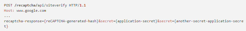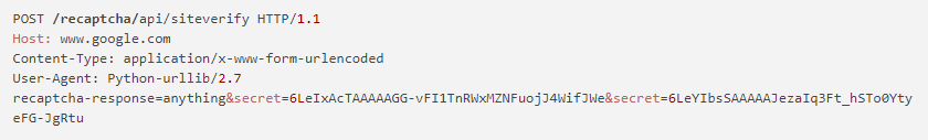 两个POST请求中都有 response 和 secret 参数。在第二个POST请求中,谷歌的reCAPTCHA API 总会采用其中的第一个secret参数,从而忽略掉第二个secret参数。严格来说,这不是一个reCAPTCHA API 本身存在的漏洞,而是一种误用机制,但可以被用来进行深入的攻击利用。