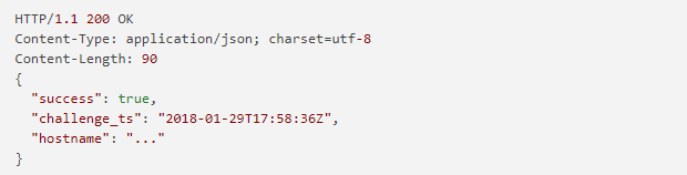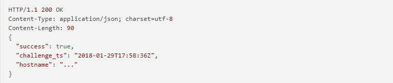 其中, {application-secret} 是用来对目标网站的验证,而 {reCAPTCHA-generated-hash} 是向谷歌reCAPTCHA API接口发送的一个响应查询,如果用户的最终测试是正确的,则API会返回以下响应信息: