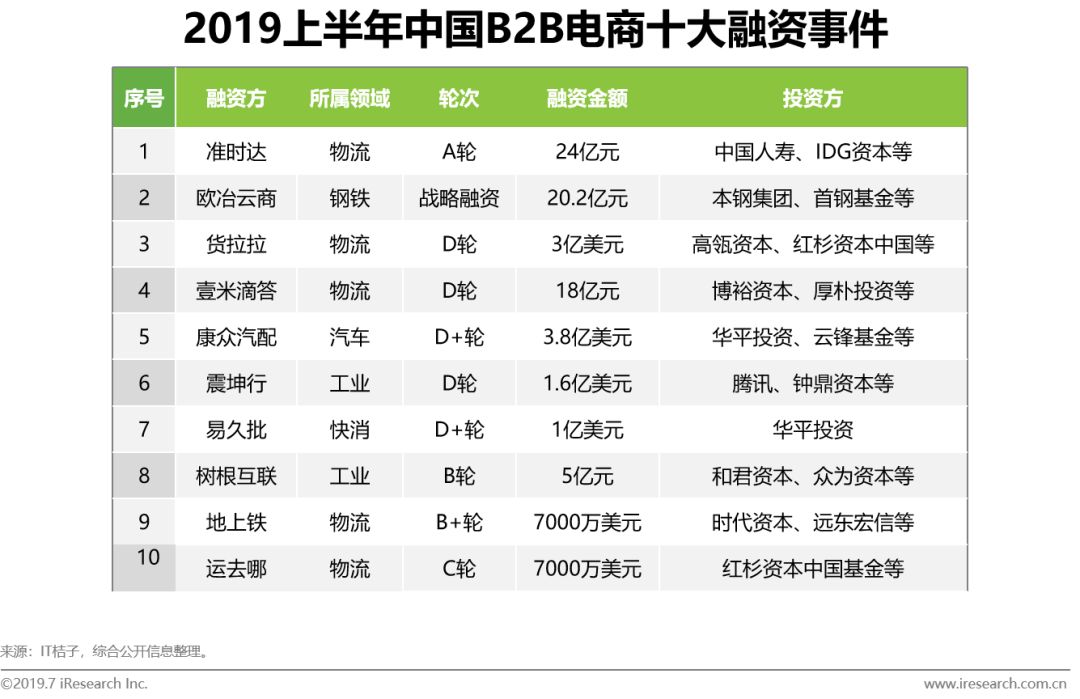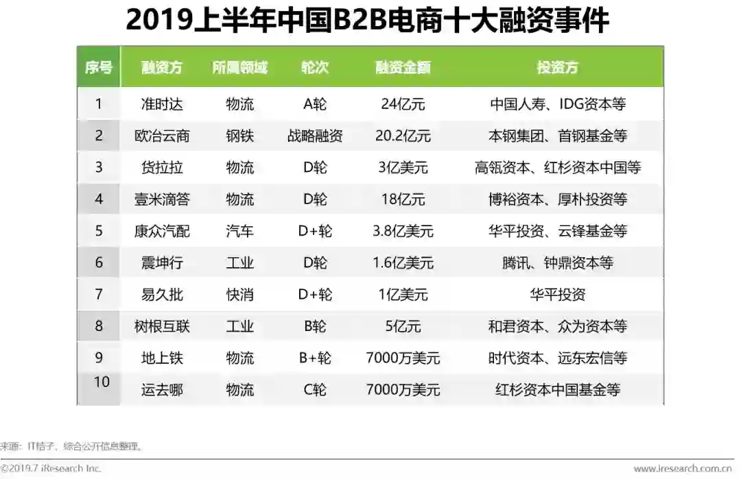 (1)从融资金额层面来看,2018年以来,农业、物流、汽车、工业、钢铁、快消、能源为B2B行业融资金额较多的细分赛道。2019年上半年B2B电商十大融资案例中,分布在物流、钢铁、汽车、工业、快消领域,这十大B2B电商融资总金额约达140.6亿元。其中2019年上半年,物流领域共计披露融资金额达到75.7亿元人民币,成为B2B行业融资金额最多的领域。(2)从融资事件层面来看,2018年以来,农业、汽车、工业、快消、建材、物流为B2B行业融资事件数量较多的细分赛道。其中2019年上半年,农业领域共计披露融资事件达到16件,成为B2B行业融资事件最多的领域。