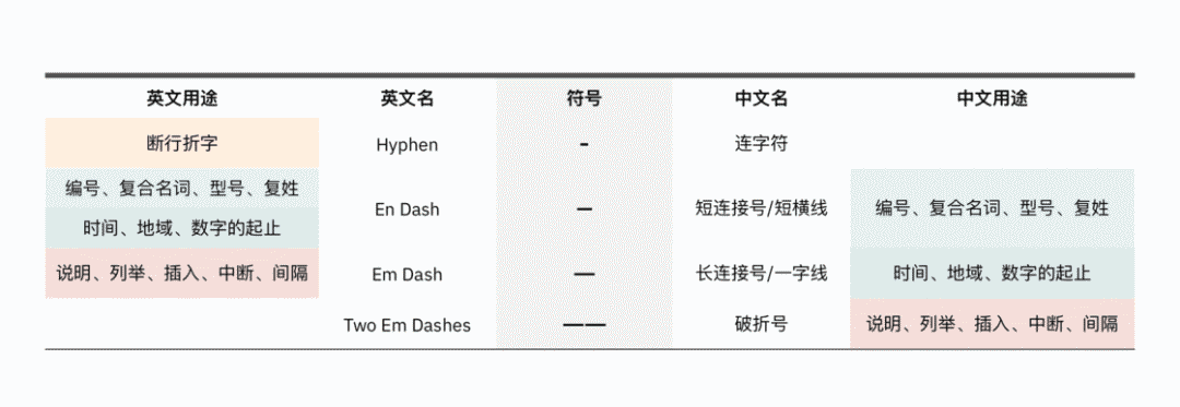 以上说的是英文中的情况,中文里的这些「横线」又是如何使用的呢?首先,连字符在中文里基本是没有用武之地的。其次,对于起连接作用的符号,国内标准将其细化为短横线、一字线和浪纹线三种,分别对应前面所说的 en dash、em dash,和 ~(U+FF5E Fullwidth Tilde)。至于三种形态的各自用途,国标的列举过于繁琐,简记方法是:一字线(em dash)和浪纹线可以互换,用于表示时间、地域、数字的起止;其他表示「连接」的场合都用短横线(en dash)。