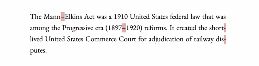 为了方便讲述和记忆,我们按照从短到长的顺序来梳理这些符号。最短的横线是连字符 -(U+2010 Hyphen-Minus),也是最容易输入的,就在键盘上数字 0 的右侧。但与多数人的直觉不同,连字符在大多数时候并不需要手动输入:它的主要用途是将较长的西文单词断成两行,而这是由软件自动加在行尾的。需要手打连字符的场景基本只有在多个部分组成的名称或词汇内部,例如 Rolls-Royce、whack-a-mole,等等。