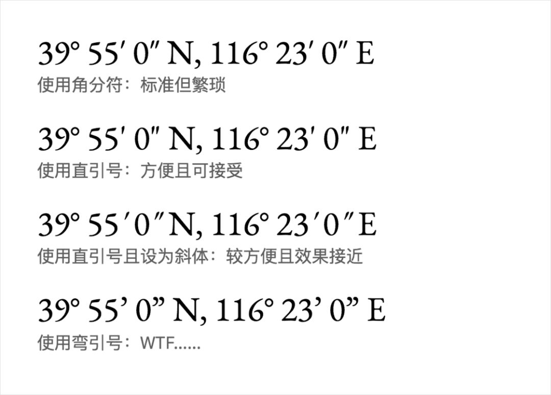 角分符号(primes)是常见于度量单位的符号,包括表示英尺、分钟等的角分 ′(U+2032 Prime)和表示英寸、秒数等的角秒 ″(U+2033 Double Prime)。这组符号在 macOS 和 iOS 上都没有快捷的输入方法;不少西文字体也没有包含它们,正确输入很多时候反而会带来不佳的排版效果。因此有观点认为,除了在用到时调用符号面板输入,用直引号来代替也是可接受的妥协方案,并且可以开启斜体来更好地模仿原符号的倾斜。(但注意不要用弯引号,因为角分符号的形态无论如何不可能是弯曲的。)