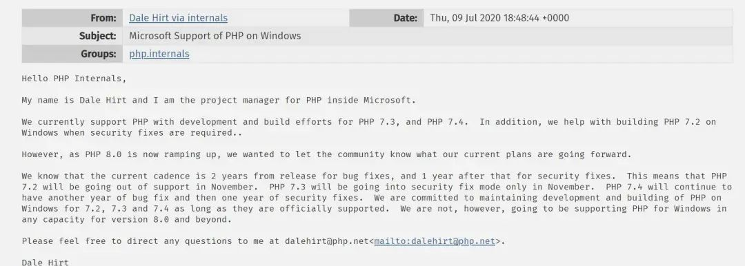 微软 PHP 项目经理 Dale Hirt 在 PHP 邮件列表中宣布,Windows 将不再支持 PHP v8 及更高版本。