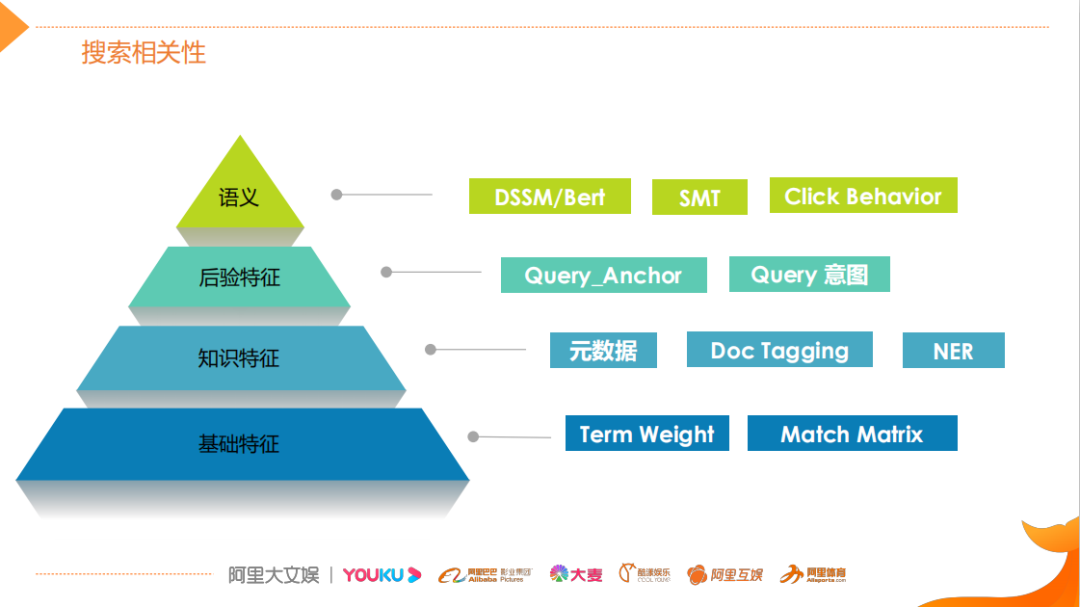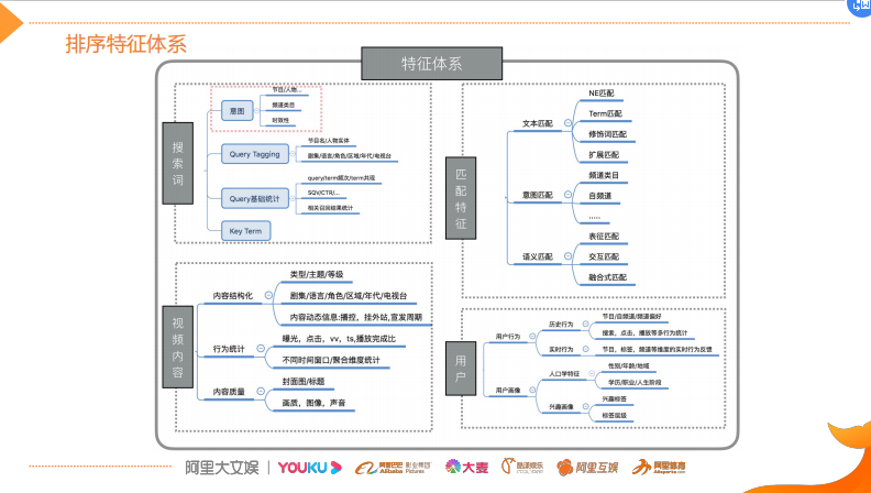 基于相关性的特征,上层排序在特征基础之上做一些整合和丰富。这里主要分为四大块的排序特征体系,那么除了Query和DOC以及它们的匹配特征之外,这些都是各业务领域通用的,比如除了技术匹配类、Query统计之外,还会增加一些视频平台所特有特征,比如说实时播控,它是为了解决排序除了体验目标之外,还要解决分发类的目标,因为它在决策领域很重要。