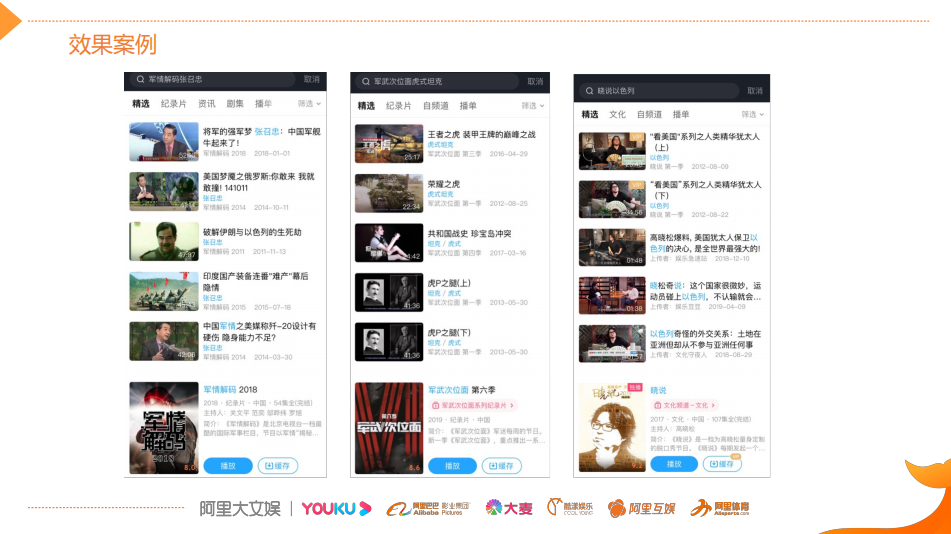 上图是基于多媒体实现的搜索案例的上线效果。最左边这案例,当用户搜索“军情解码张召忠”时,可以看出来排在前面的几个视频,它内容都是张召忠主讲的。但是,标题上其实没有张召忠这个名字,我们是通过算法将内容进行理解,将它从视频模块中抽取出来,同时以这种关键字的方式进行外显。其它的案例也是类似的,就是说视频开头中没有用户想要的东西,但是视频内容中有,所以这个时候就需要用多媒体视频检索的方式。