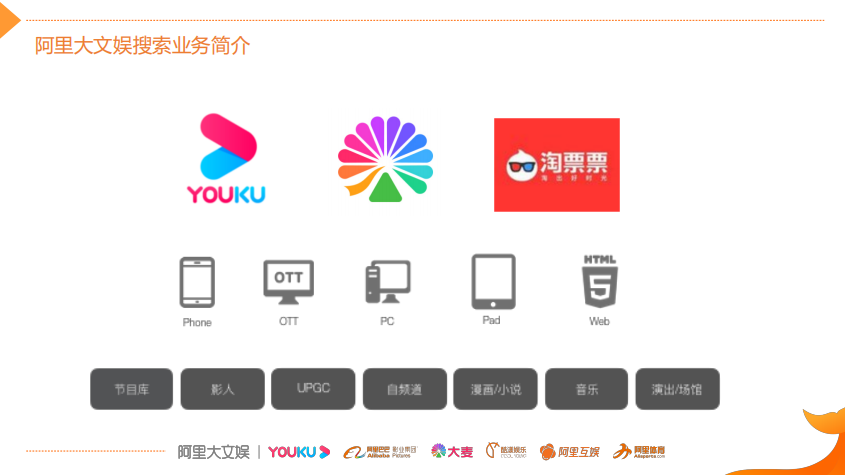 搜索为整个阿里文娱提供一站式的搜索推荐服务,服务范围不仅包括优酷的全部的搜索入口,比如APP端、OTT大屏端、PC端还有网页端等等,还会涉及到大麦、淘票票等领域。涉及的检索内容从传统的影剧、动漫这些有版权的长视频影视库之外,还会覆盖社会各个领域的UPGC的视频内容,此外比如影人、演出、小说也都是大文娱搜索各个业务领域的需求,需要提供检索服务。