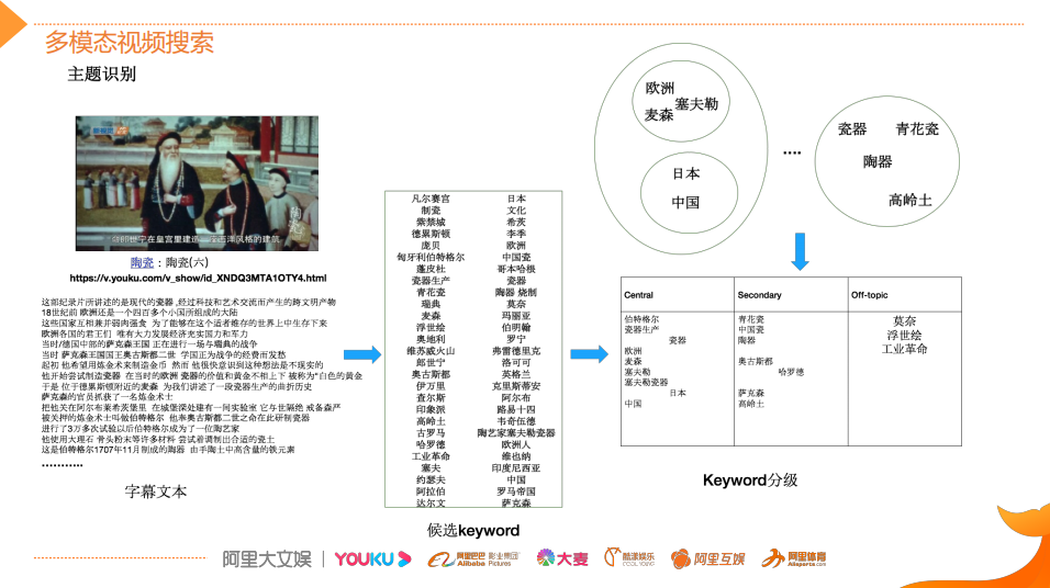 如图,该视频讲的是欧洲陶瓷,但是它的标题非常简单就是陶瓷这几个字,字幕文本是利用OCR技术识别出来的。字幕文本所承载的内容关键词词数非常大,此外,内容和关键词属于多得多的关系,所以通过多样化的关键词抽取技术来提取候选关键词,同时能够扩大候选词来源的多样性。基于NER的方法能够确保抽取的关键词是百科类的实体,有比较广泛的知识内涵。而新词发现的方法,它结合N-gram以及语言模型等多种能力来扩大对未知知识领域的挖掘。挖掘的候选关键词的量其实是非常大的,在关键词基础之上,根据视频的内容和候选词的匹配程度或者说相关性来进行关键词的分级,通过分类模型将其分类成最核心的关键词,有普通的关键词以及提及关键词。关键词分级的核心特征除了文本特征之外,还会采用音频、视频等多模态的特征来共同训练,进而提升分类准确率,将关键词和内容表达的关联度预测更加精准。在这一过程中会面临一些挑战,比如这个视频讲的是欧洲瓷器的发展史,但是视频标题很简单。我们虽然把内容将变成文本之后,能够利用前面提到的关键词提取技术抽取出欧洲、麦森和塞夫勒等关键词,但是如何把这些关键词和欧洲联系起来,理解这个视频讲的是欧洲的发展史,而不是中国或者日本。此外,对于瓷器领域(比如陶青花、瓷高岭土)的知识实体,怎么知道该实体和瓷器讲的是类似的事情,那么这里就需要有科技作为支撑了。因为科技的实体知识库能够涵盖比较广泛的领域,比如说全行业的丰富的实体信息,能够帮助提取核心内容主题。此外,算法还需要有实体间的关系推理的能力,才能更加全面的理解视频,然后更好地支撑上层的召回、匹配和排序。