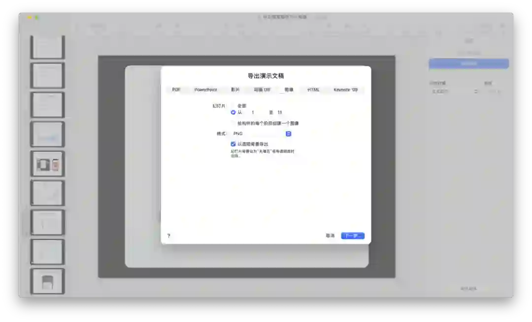另一个是 Keynote 自带的影片或动画 GIF 导出功能。影片导出设置繁杂,我不推荐。如果导出 GIF,还需注意分辨率和帧率。一般来说,Keynote 自带的 GIF 导出的文件过于庞大,我会选择使用如 Gifski 等软件进行二次压缩。