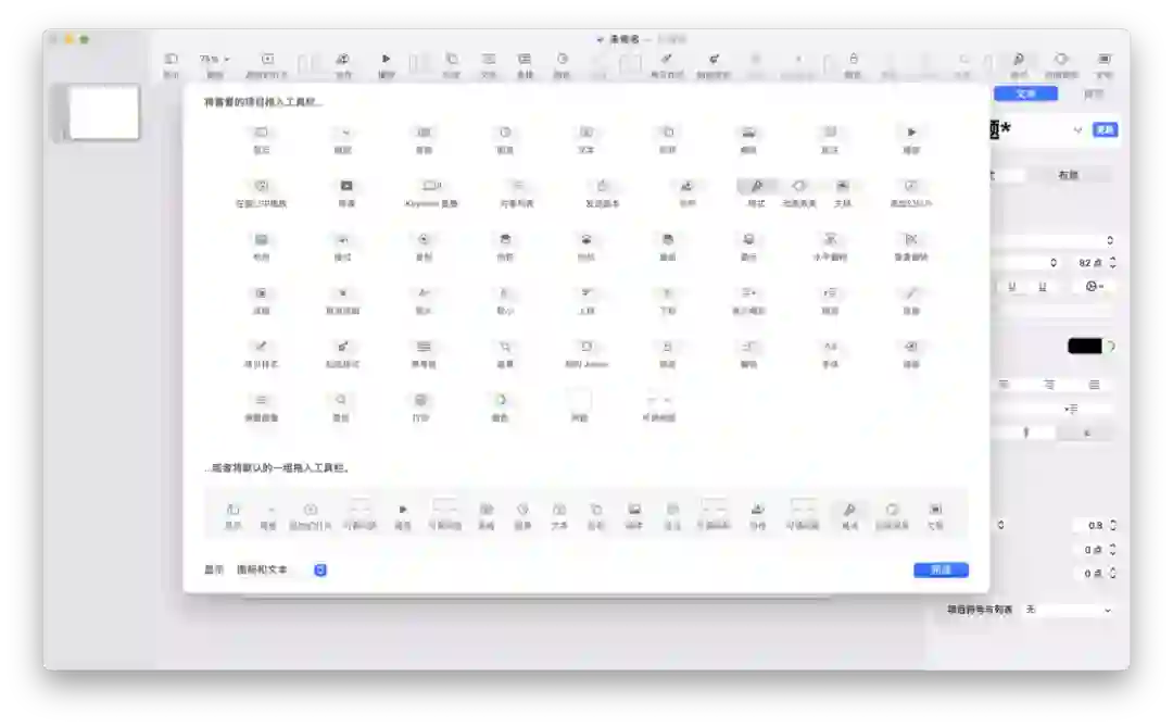 很多人不知道 iWork 套件的工具栏是可以自定义的,只需要在上面右键「自定义工具栏」即可。如果没有什么偏好,建议就按照我图中的方式排列功能。像「拷贝 / 粘贴样式」「锁定 / 解锁」「Alpha」「遮罩」等常用功能,如果不放在工具栏上,就要去繁琐的二三级菜单里寻觅,很是麻烦。