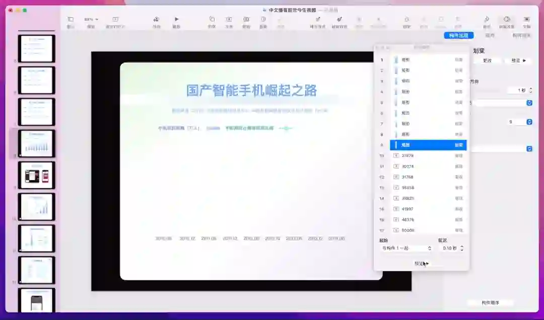 为了方便上手,Keynote 也很细心地为不同的构件顺序选择做了不同的菜单栏展示,「在点按时」顺序的目标构件与前一个构件有间隔;「与前一个构件一起」顺序的目标构件与前一个构件间是虚线;「在前一个构件之后」顺序的目标构件与前一个构件间是实线。