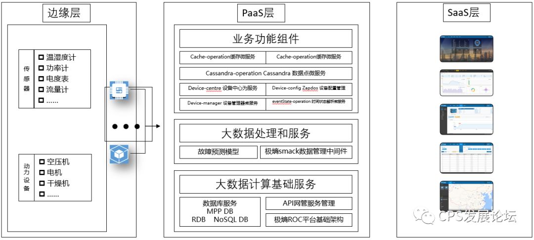 针对极熵物联动力设备智能服务云平台(DbPE-CPS),极熵物联整体构建了三个层次总体架构,如下图所示: