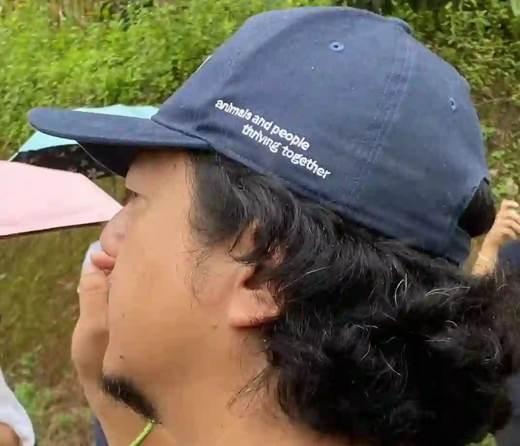 大藩的帽子上写着:animals and people thriving together;拍摄:苏建勋