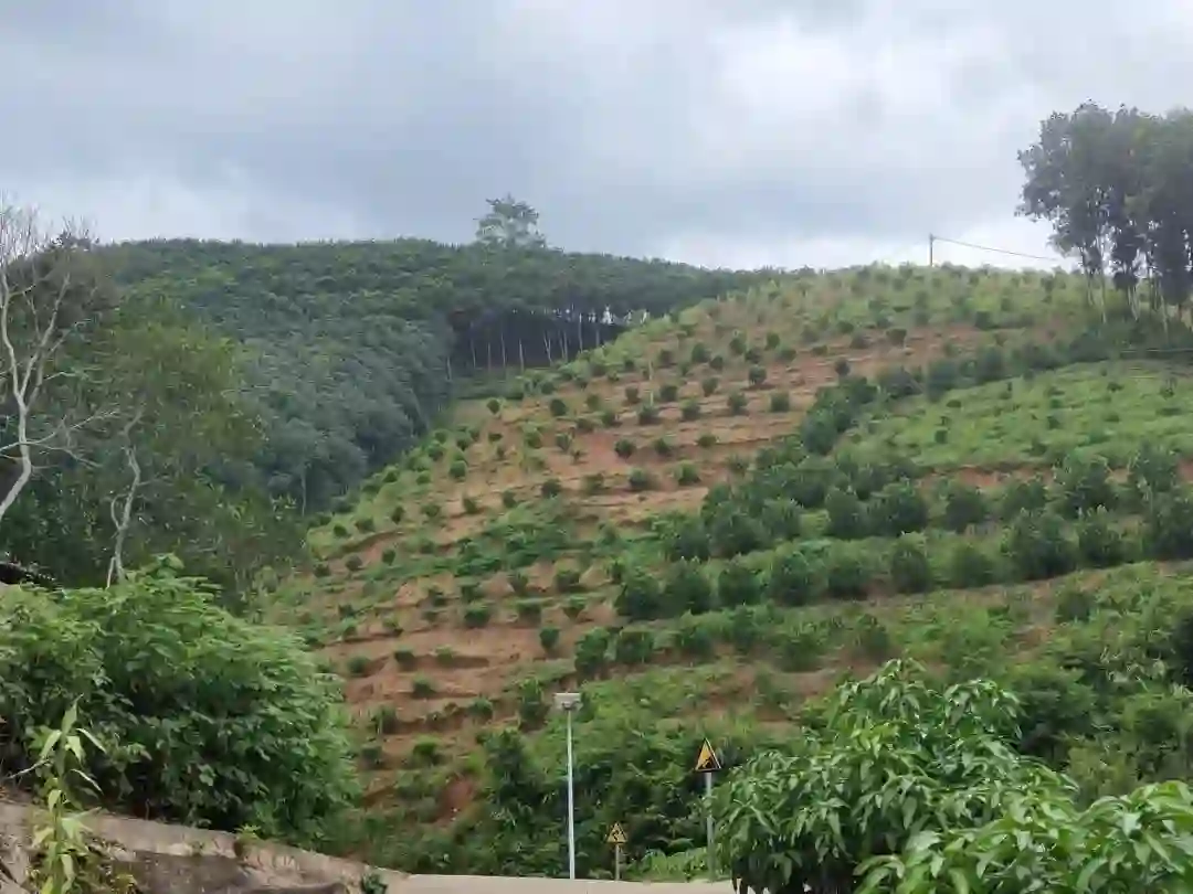 行程中,倒淌箐村民张江美与我们同行,村子背后的山坡上,一排排新种的灌木郁郁葱葱,张江美指着这些作物,说:“这儿,原来种的都是橡胶树,现在都改种芒果、坚果了。”
