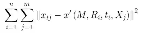 现在我们来考虑透镜畸变的影响,由于径向畸变的影响相对较明显,所以主要考虑径向畸变参数,根据经验,通常只考虑径向畸变的前两个参数k1,k2就可以(增加更多的参数会使得模型变的复杂且不稳定)。实际求解中,通常把k1,k2也作为参数加入上述函数一起进行优化,待优化函数如下所示