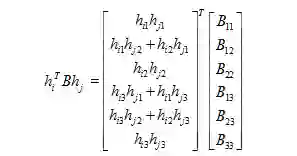 我们看到B为对称矩阵,真正有用的元素只有6个(主对角线任意一侧的6个元素)。把B带入前面两个约束条件后可转化为: