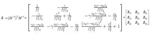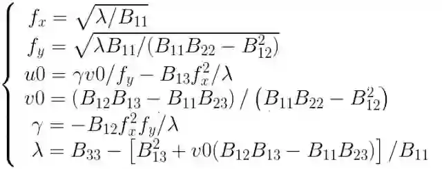 假设我们已经根据前面计算得到了矩阵B元素的值,那么根据已知的矩阵B很容易解出内参,如下: