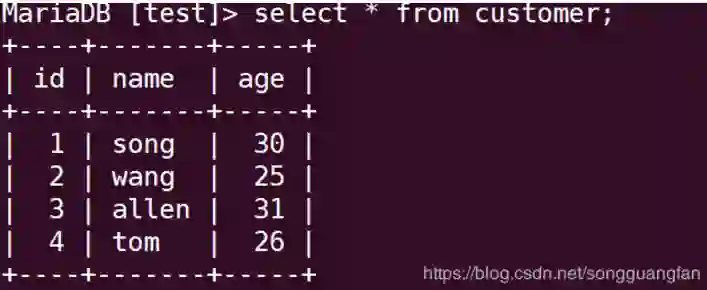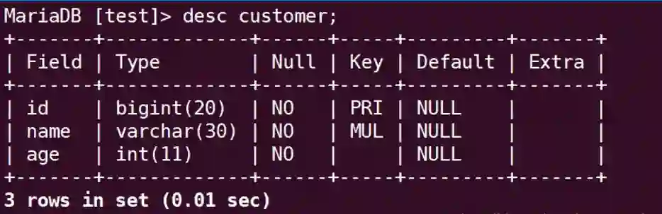 举个例子, 假设有一张customer表,有id、name、age三个字段,表结构如下图所示: