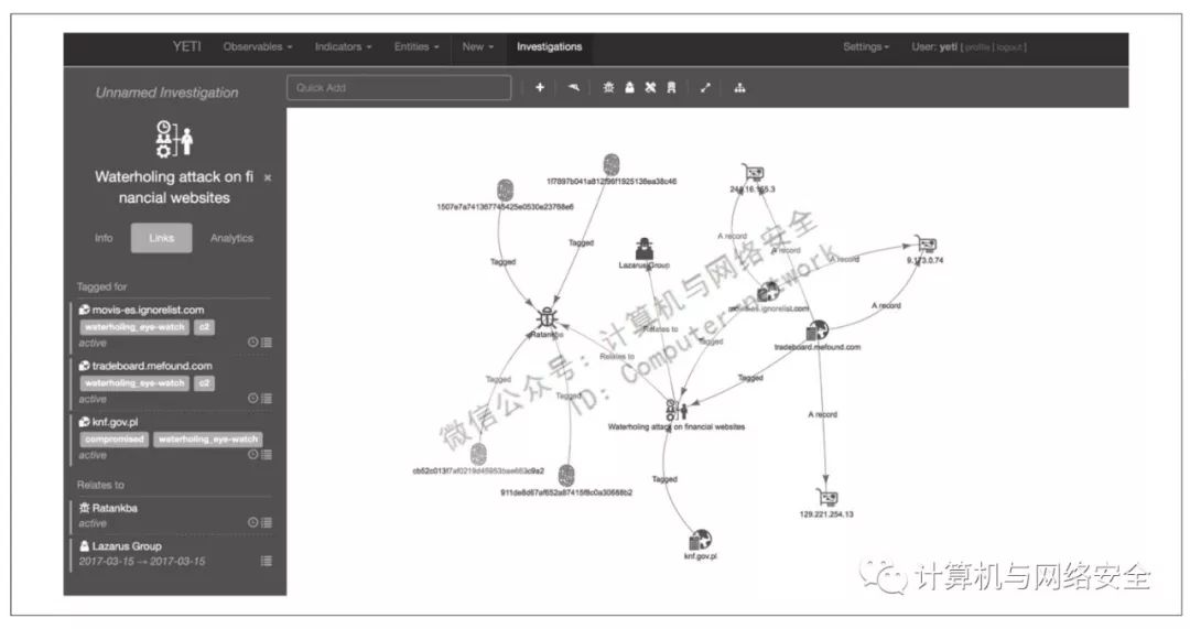“你的每日威胁情报”(Your Everyday Threat Intelligence,YETI)平台是一个较新的威胁情报管理工具,于2017年3月公开发布(见图3)。YETI旨在为分析人员提供一个用于管理和分析威胁情报各个部分的集成环境,不仅支持可观测对象、攻陷信标和TTP,也支持威胁相关的常规知识。YETI的一个强大之处在于,除了支持存储已发现的威胁相关信息之外,还支持拓展信标,包括域名解析和WHOIS查询,同时也可以通过配置与其他工具集成。YETI可以接收MISP、JSON和XML格式的反馈数据,也可以从多种恶意代码沙箱工具接收数据。YETI专门为应对威胁情报分析人员近年来遇到的许多挑战而设计,因为对于同样的信息,许多分析人员往往需要以不同过程或流程处理,所以YETI被设计得极为灵活。在GitHub(https://github.com/yeti-platform/yeti)上可以找到YETI的安装信息和使用文档。