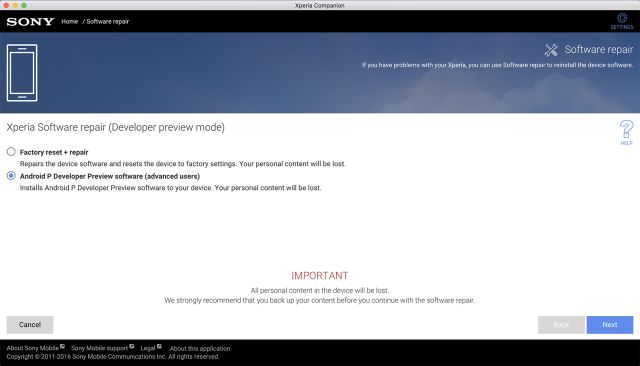 不同于之前以 Nexus 6P 和 Pixel C 刷 Android N beta,只需要简单登记就可以通过接收 OTA 更新刷机,第三方厂商要刷进 Android P beta 都需要使用电脑端的软件来灌入新系统。在索尼把问题修正后,就只要简单按照画面指示来操作,不消十数分钟就把 XZ2 刷进 Android P beta 了。
