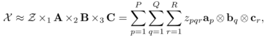 根据 Tucker decomposition 的计算方式,TuckER模型可以表示如下: