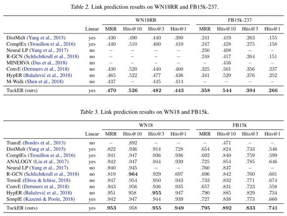 本文的主要实验任务是 link prediction。数据集采用了当前流行的 FB15K-237 和 WN18RR,同时也测试了传统的 FB15K 和 WN18。作者开源了基于 PyTorch 的代码https://github.com/ibalazevic/TuckER。实验结果如下表所示。可以看见,在目前主流的FB15K-237 和 WN18RR 数据集上,TuckER 取得了 SOTA 的效果,并且比第二名领先较多。而在传统的 FB15K 和 WN18 上面,TuckER 在主要指标上,也取得了最优结果。基本可以认为,TuckER 是当前 link prediction 的 SOTA 模型。