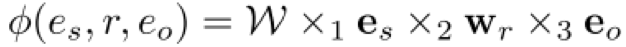 其中,es 和 eo 表示实体向量,wr 表示关系向量,de 和 dr 分别表示实体和关系的向量维数,W是Tucker decomposition得到的核心张量。则TuckER的得分函数定义如下: