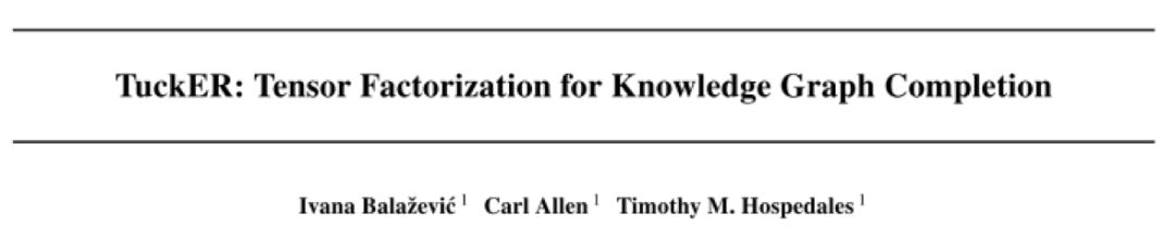 知识图谱是图结构的数据库,以三元组(es, r, eo)的形式存储事实,其中es和eo分别表示主语和宾语实体,r表示它们之间的关系。然而,知识图谱中的事实是不完备的,人工补全费时费力,这就需要开发自动化补全知识图谱的算法。知识图谱可以表示为一个三阶二值张量,其中每一个元素表示一个三元组,1表示真实三元组,0表示未知三元组(或错误或丢失)。因此,很多基于张量分解的补全模型被提出。本文基于Tucker decomposition, 它可以将一个三阶张量分解为一个核心张量每一维度乘上一个矩阵。令是一个三阶张量,Tucker decomposition 会产生一个核心张量