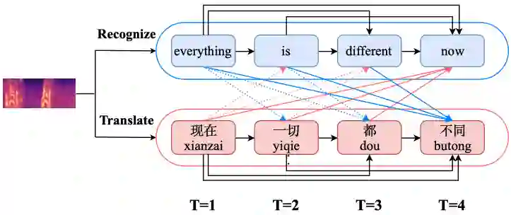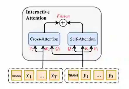 相比于直接将原始语音作为输入,如果能够动态获取到识别出的文本信息,语音翻译将变得更加容易;而翻译出的结果也有助于同音词识别的消歧,使识别结果更加准确。因此,我们希望设计一种交互式的模型,让语音识别与语音翻译两个任务可以动态交互学习,实现知识的共享和传递。