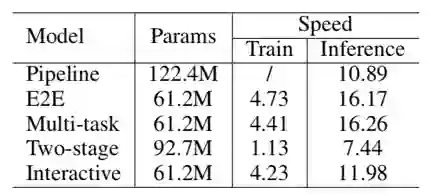 我们也对比了不同模型的参数量、训练和解码速率。表3给出了模型的参数量大小、每秒的训练步数和每秒的解码句子数。可以看出,我们的模型较好的平衡了参数量和解码速率,相比级联系统,参数量获得的大幅降低;训练和解码速率显著低于两阶段模型;虽然解码速率略低于预训练端到端模型和多任务模型,但是我们的方法可以实现两个任务的同步解码。