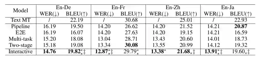 语音识别和语音翻译的结果分别使用词错误率(WER)和BLEU进行衡量。我们与多个强基线模型进行了对比,包括由语音识别和机器翻译模型串联组成的级联系统(Pipeline),在语音识别语料上进行预训练的端到端语音翻译模型(E2E),语音识别和语音翻译共享编码器的多任务模型(Multi-task),以及一个两阶段模型(Two-stage)(第一阶段解码器用于获取识别文本的中间表示,第二阶段解码器基于编码器的表示和第一阶段解码器的中间表示生成对应的翻译)。