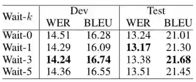 在训练阶段,两个任务同时优化;在解码阶段,两个任务同步进行。如此,在预测下一个词的过程中既可以用到当前任务的已生成的词语,也可以利用到另一个任务上已生成的词语。为了进一步提升语音翻译的性能,我们采用了一种wait-k的方法