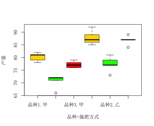 > boxplot(产量~品种+施肥方式,col=c("gold","green","red"),ylab="产量",xlab="品种+施肥方式", data = example8_5)