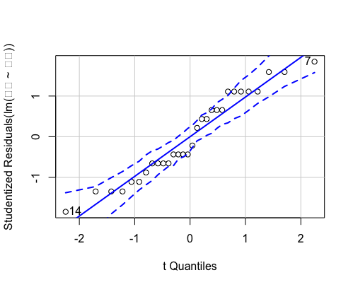 > qqPlot(lm(产量~品种))