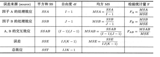 考虑交互效应的双因子方差分析表