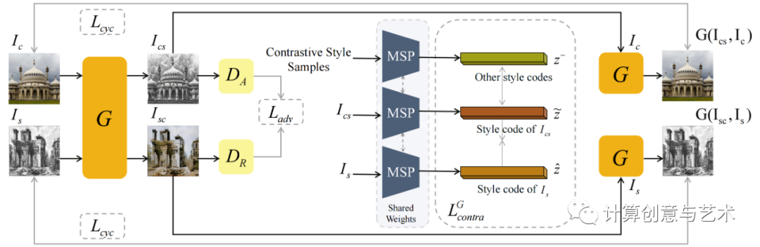 对比表示还为生成器G 在图像之间传输风格提供了适当的指导。我们采用与上式中用于学习MSP相同形式的对比损失,但使用输出图像 Ics和参考图像Is的对比表示来计算损失,那么Ics将具有类似于Is的风格: